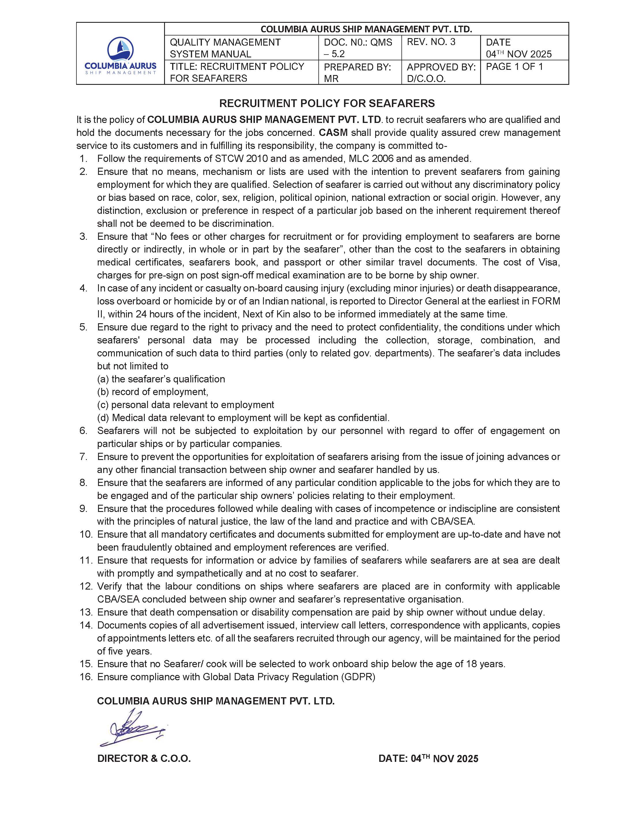 RECRUITMENT POLICY FOR SEAFARERS